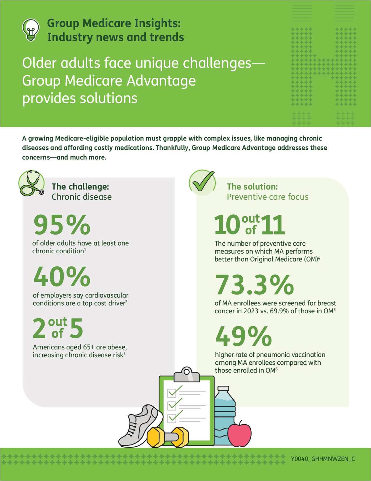 A surge in Medicare-eligible retirees is pressuring your clients. This data-backed guide shows how Group Medicare Advantage improves preventive care, expands access (including telehealth), and reduces drug costs–so you can solve your clients’ pain points and grow your business.